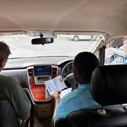 Dann der kleine Schreck: Das Auto springt nicht an. Zum Glück entdeckt Jens ein loses Batteriekabel. Gleich um die Ecke, im Hinterhof der Mietwagenfirma, wird es schnell repariert. Willkommen in Afrika!