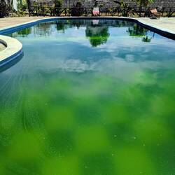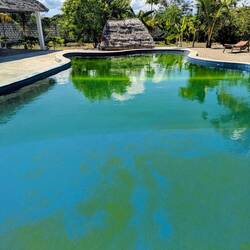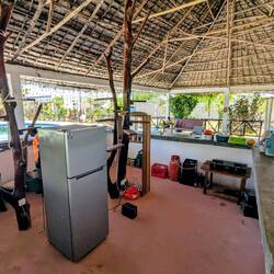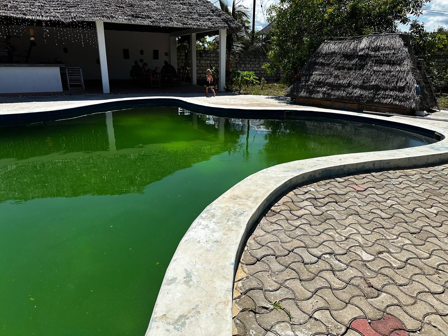 In der Mitte liegt ein großer Pool, der in der Anzeige sehr schön aussah. Nun ist das Wasser grün. Auch die Küche ist keine richtige Küche: ein offener Barbereich mit Sofas, Sesseln und einem Tisch. In der Mitte ein großer Bartresen mit einem Gaskocher, der nur auf einem Brenner funktioniert. Es steht schmutziges Geschirr herum und der Kühlschrank ist verschimmelt. Das Wasser tropft nur aus den Wasserhähnen. Strom? Fehlanzeige!