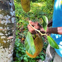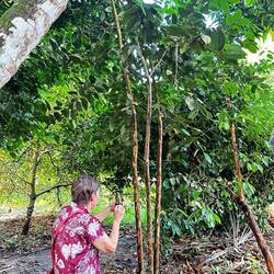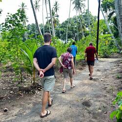 Wir sehen Kurkuma, Aloe Vera, Ingwer, Kardamom, Orangen, Limonen, Passionsfrüchte, später Nelken und schließlich Pfeffer, der als Kletterpflanze an Bäumen wächst. Je nach Reife entsteht daraus grüner, roter oder schwarzer Pfeffer. Wir entdecken außerdem Zimt, Papaya, Bananen, Kaffee (Arabica und Robusta), Jackfrucht und Zitronengras.