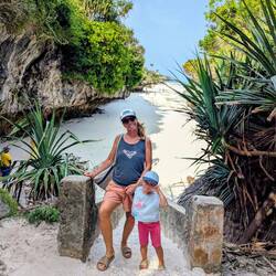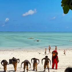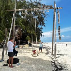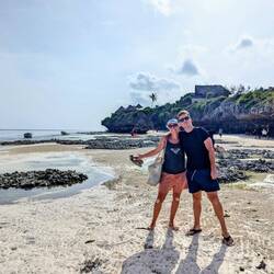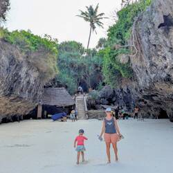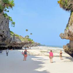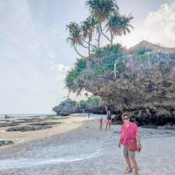 Im Süden besuchen wir den Mtembe Beach. Der schönste Strand auf Sansibar. Zwischen zwei Felsen liegt dort ein natürlicher Strand, der nur bei Ebbe zugänglich ist. Bei Flut verschwindet er komplett. Wir schauen uns diesen besonderen Ort an und merken einmal mehr, wie vielseitig Sansibar ist. Auf der Fahrt dorthin geht es durch dichte, sattgrüne Natur. Direkt am Strand steht ein riesiger, beeindruckender Baum, und der Strand selbst ist wunderschön.