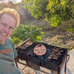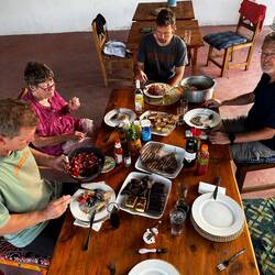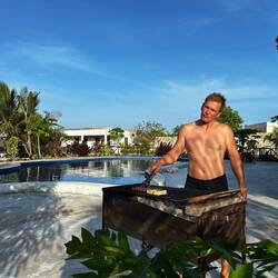 Am Nachmittag gehen wir gemeinsam Eis in Paje essen. Danach fahren wir zurück und beginnen das BBQ für den Abend vorzubereiten. Es gibt Steak, Hähnchen und sogar Fisch, dazu einen leckeren Nudelsalat. Alles schmeckt wunderbar.
