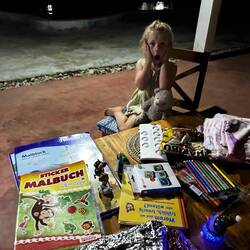 Nach dem Essen folgt die Bescherung. Sebastian geht mit Marie ein wenig umher und hält Ausschau nach dem Christkind. Ob es wohl auch den weiten Weg nach Sansibar findet? Währenddessen bereiten Jens und Regina die Geschenke vor und legen sie heimlich unter die geschmückte Papaya-Pflanze.