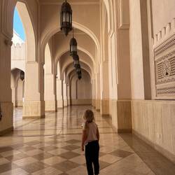 Am nächsten Morgen warten wir auf eine Antwort vom Agenten. Nichts passiert. Also gehen wir frühstücken und schauen uns die Moschee an. Die Frauen tragen lange Kleidung und ein Tuch, aus Respekt. Die Moschee ist groß, gepflegt und sehr sauber, draußen wächst sogar Gras. Eintritt zahlen wir keinen.