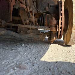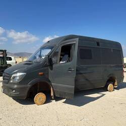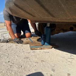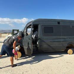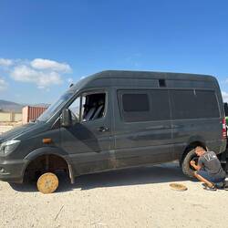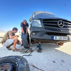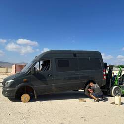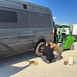 Auf dem Schotter leiden die Holzräder sichtbar, aber sie haben ihren Zweck erfüllt. Am Auto selbst ist alles heil. Innen wie außen keine Schäden. Die Freude ist groß. Dann geht alles plötzlich sehr schnell. Hinten wird der Sprinter mit dem Gabelstapler angehoben und die richtigen Räder montiert. Vorne machen wir es vorsichtig mit Wagenhebern. Rad für Rad. Mit etwas Geduld klappt alles reibungslos. Schrauben fest, Luft rein, der Camper steht wieder auf eigenen Rädern.