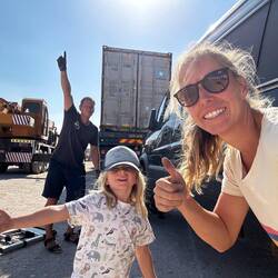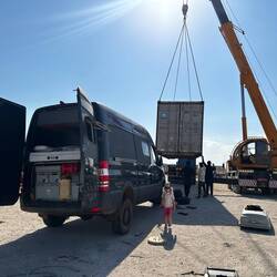 Dort steht der Container bereits offen auf einem Schotterplatz. Unser Sprinter steht drin. Unversehrt. Die Türen sind offen, niemand war im Auto. Die Erleichterung ist riesig. In der Mittagshitze warten wir noch einmal, bis es weitergeht. Dann lösen die Arbeiter die Verzurrungen. Am Dachfenstereinbaurahmen entfernt Jens noch Metallklammern, die beim Verladen oben an der Einfahrt geschliffen hatten. Langsam rollt der Sprinter auf den Holzrädern aus dem Container. Es passt alles. Nichts schleift. Ein guter Moment.
