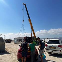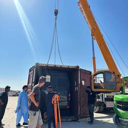 Nachdem die Batterie abgeklemmt ist, klettert Jens durch den Innenraum nach draußen. Auch die Hafenarbeiter müssen das Fahrzeug auf diesem Weg verlassen. Dann ist es geschafft. Der Sprinter steht sicher im Container und wird verplombt. Die Erleichterung ist riesig. Dann wird der Container mit einem Kran hochgehoben und auf anderen Container abgestellt.