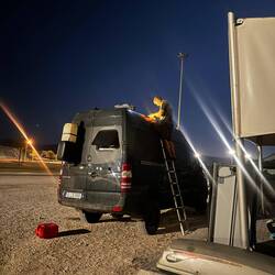 Wir laden die Dachbox ins Auto, fahren einkaufen und tanken Wasser. Erst danach geht es weiter Richtung Strand. Es ist schon dunkel, als wir ankommen. Jetzt beginnt der letzte Kraftakt. Alles wird ausgeräumt und neu verstaut. Der Dachlüfter kommt wieder drauf, die Dachträger werden montiert, die Solarpanels aufgebaut und die Markise angebracht. Zwischendurch essen wir noch gemeinsam etwas. Marie ist längst eingeschlafen.
