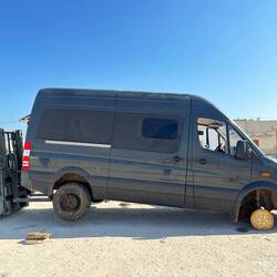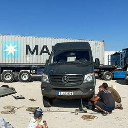 Heute verladen wir unseren Mercedes Sprinter in einem 40 Fuß High Cube Container mit Ziel Oman. Gestern bereiteten wir das Fahrzeug vor und entfernten alle Dachaufbauten. Am Morgen fahren wir gemeinsam mit unseren Freunden Jerome und Leslie zu dem Lagerhaus, in dem die Container beladen werden.