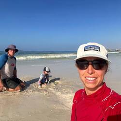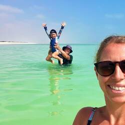 Am Nachmittag erreichen wir einen schönen Strand. Jérôme und Leslie sind schon vorgefahren und wir verbringen gemeinsam einen warmen Abend am Meer. Am nächsten Tag fahren wir weiter und entdecken plötzlich Delfine, ganz nah am Ufer. Wir wissen, dass man hier mit ihnen ins Wasser kann. Also ziehen wir uns schnell um und gehen mit Marie hinein. Die Sicht ist durch die Algen etwas trüb, doch immer wieder tauchen die Finnen neben uns auf. Regina zieht Marie auf der Schwimmnudel hinter sich her und von oben sieht sie die Tiere auftauchen. Die Delfine schwimmen in kleinen Gruppen, manchmal zehn oder fünfzehn, sogar mit ihren Babys. Sie ziehen unter uns hindurch, drehen neugierig ihre Runden und kommen immer wieder zurück. Fast eine Stunde bleiben wir im Wasser, gehen kurz an Land und wieder hinein, jedes Mal sind sie noch da.