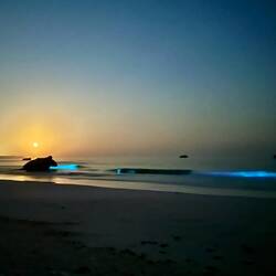 Am Abend, als wir am Lagerfeuer sitzen ist es überraschend kühl, Pulli und lange Hose tun gut. Dann passiert etwas Magisches. Die Brandung beginnt zu leuchten. Biolumineszenz. Winzige Leuchtalgen, sogenannte Dinoflagellaten, bringen das Wasser bei jeder Bewegung zum Glitzern. Kurz darauf geht ein riesiger, roter Mond über dem Meer auf, einfach schön!