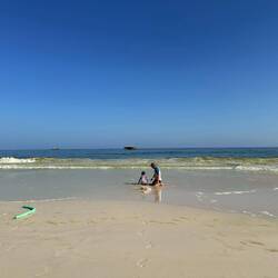 Die Tage vergehen mit Warten. Am Donnerstag passiert nichts, am Freitag ist Feiertag. Marie nimmt ihre letzte Malaria Prophylaxe in Form eines Cocktails. Regina und Jens müssen noch einen Monat ihre Tabletten weiternehmen. Wir fahren an den Strand, das Wasser ist ruhig und klar. Regina badet etwas bedeckter. Beim Spazierengehen treffen wir deutsche Overlander, die durch den Irak gefahren sind und begeistert erzählen. Das macht uns Mut.
