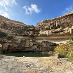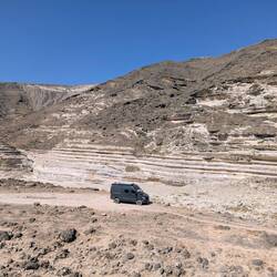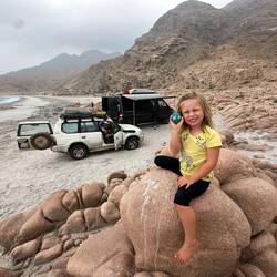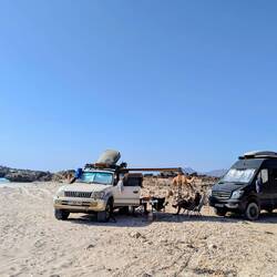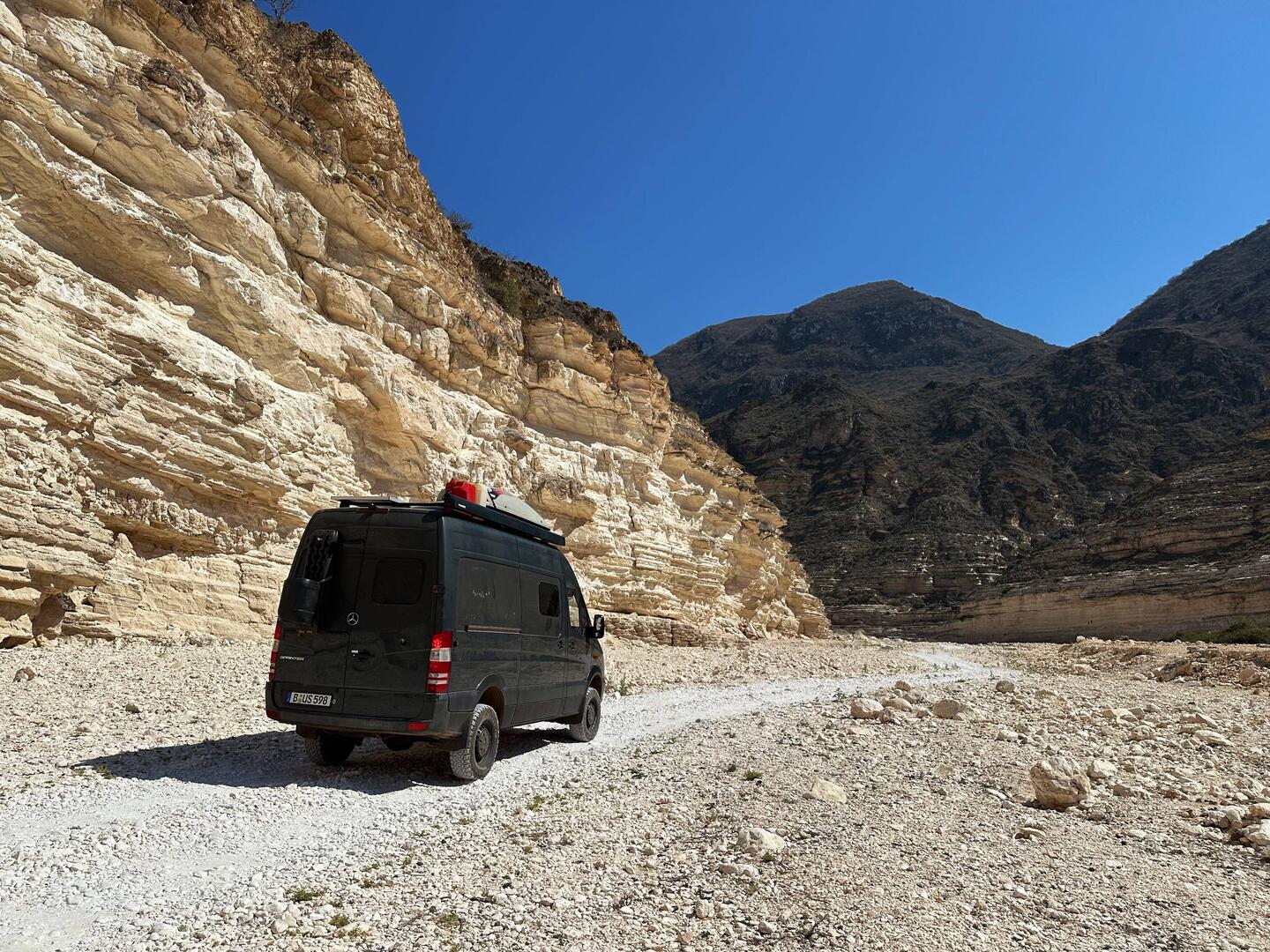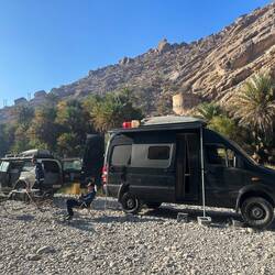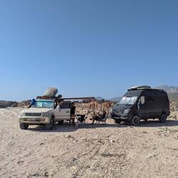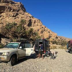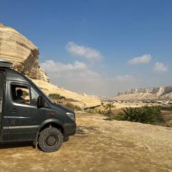 Gegen Mittag brechen wir auf und fahren weiter zu einem Wadi nördlich vom Delfinstrand. Das klare Süßwasser liegt ruhig zwischen den Felsen. Regina und Leslie machen gemeinsam Sport und springen anschließend ins Wasser. Am Abend sitzen wir am Lagerfeuer, es ist still und friedlich. In der Nacht hört man nichts außer dem leisen Wind. Am nächsten Morgen geht unsere Reise weiter.Read more