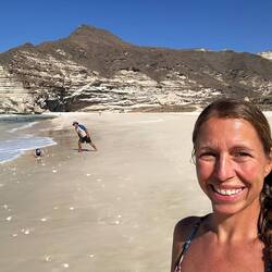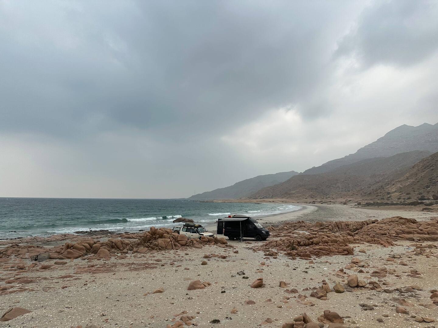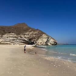 Später fahren wir weiter zum Fasaia Beach südlich von Salalah. Erst hinauf ins Gebirge, dann über eine gut fahrbare Schotterpiste hinunter. Schon von oben sehen wir den Strand unter uns liegen. Unten angekommen ist es ein Traum. Breiter, flacher Sandstrand, ruhige Wellen. Perfekt für Marie. Wir machen es uns mit Lesley und Jerome gemütlich, baden, kochen zusammen, essen am Strand.