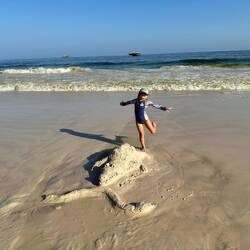 Nach einem kurzen Zwischenstopp in Salalah stehen wir wieder zwischen vertrauten Fahrzeugen. Antje mit ihrem großen Truck ist da und auch Marion und Karsten. Wir bleiben einen Tag und noch den nächsten Morgen. Marie versteht sich auf Anhieb mit allen, besonders mit Karsten. Er war früher Schwimmlehrer und geht mit ihr ins Meer, spielt mit ihr im Wasser und beide lachen ununterbrochen. Wir sitzen lange zusammen, erzählen und genießen das Wiedersehen, doch dann ruft uns die Straße wieder.