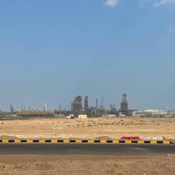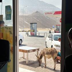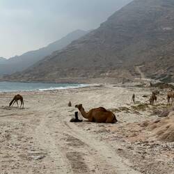 Wir fahren durch die scheinbar endlose Weite Omans von südlich Shabitāt bis nach Duqm. Die Straße zieht sich durch flirrende Hitze, der Horizont beginnt zu tanzen und immer wieder liegt eine Fata Morgana vor uns. Meist ist da nichts außer Sand und Licht, nur ab und zu eine Ölförderpumpe oder ein einzelnes Kamel. Stundenlang dieses gleichmäßige Brummen des Motors, während draußen die Sonne alles in helle Farben taucht und wir dankbar in der kühlen Luft des Busses sitzen.