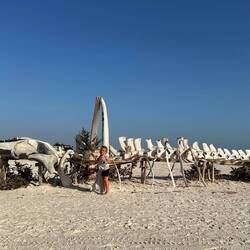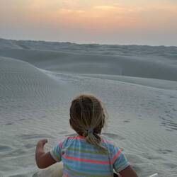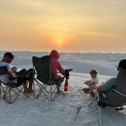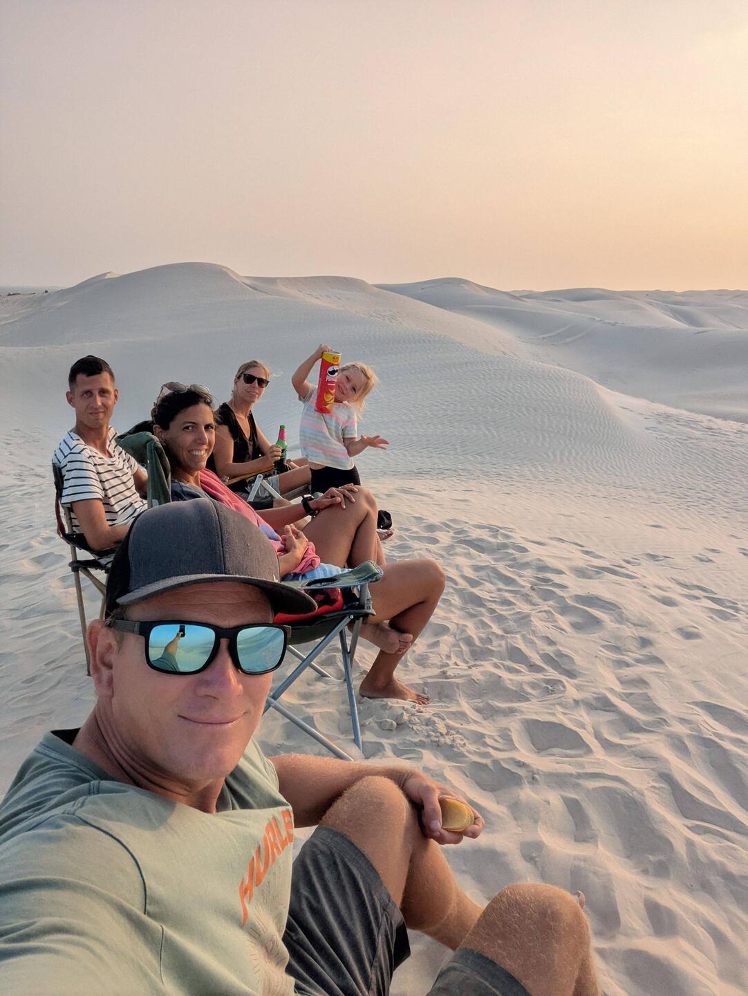 Am Nachmittag erreichen wir die Sugar Dunes. Der Sand ist so hell und fein, dass er im Abendlicht fast weiß leuchtet. Jérôme und Leslie fahren mit ihrem Wagen hinein in die Dünen, wir bleiben am Meer stehen und laufen ihnen entgegen. Oben setzen wir uns mit unseren Stühlen und Getränken (kein Alkohol) auf eine Düne und schauen gemeinsam in den Sonnenuntergang und lassen den Tag ausklingen.