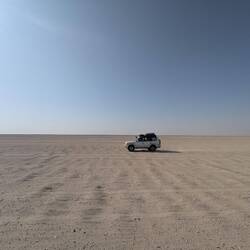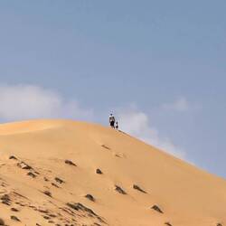 Am Ende finden wir ein paar Bäume für die Mittagspause und fahren danach noch einmal zum Spielen in die Dünen. Für eine besonders steile brauchen wir drei Anläufe, dann stehen wir oben im flirrenden Licht der Mittagssonne, die Hitze drückt und wir flüchten schnell wieder in die kühle Fahrerkabine. Wir lachen, probieren noch ein bisschen herum und genießen einfach diesen Moment.