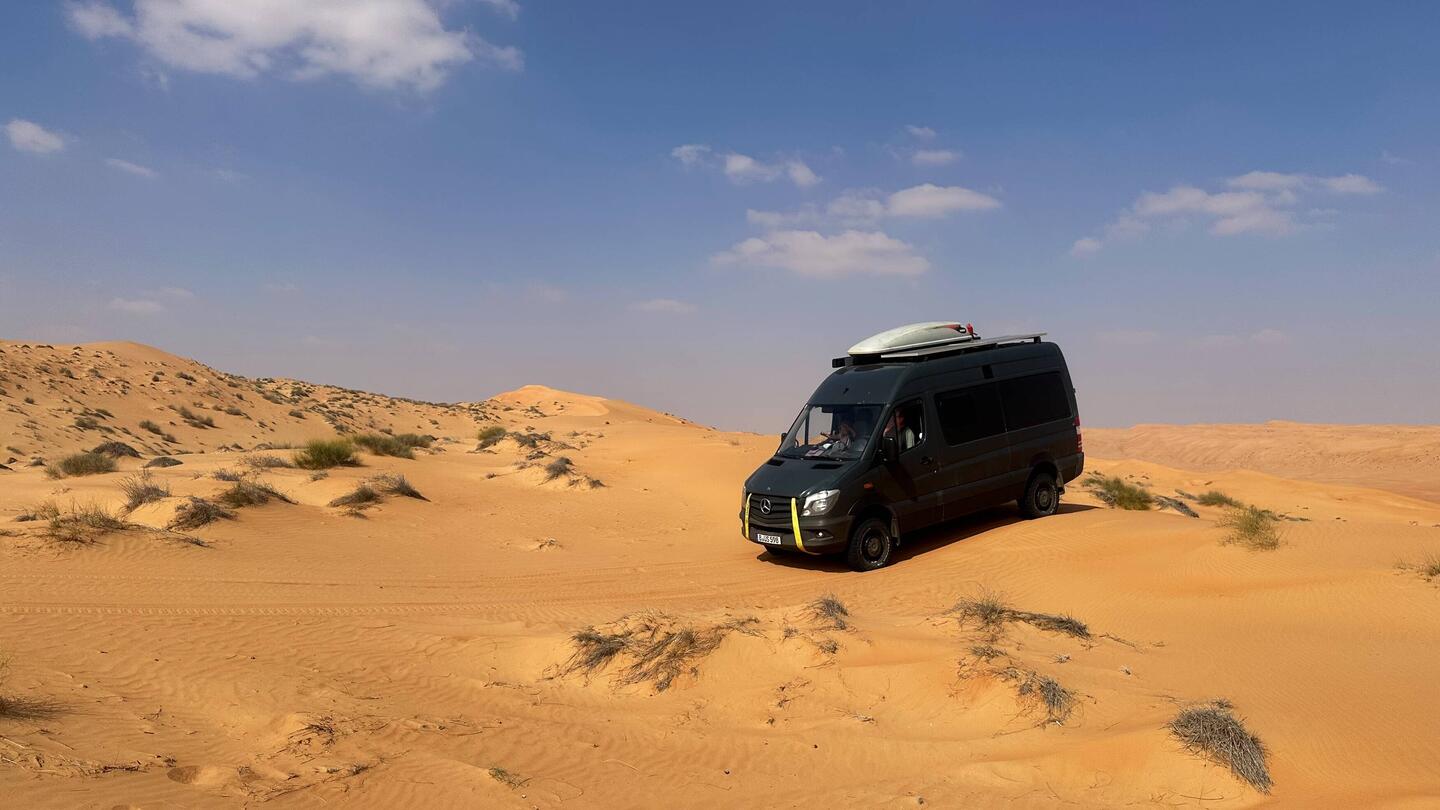 Die Wahiba Sands breiten sich vor uns aus wie ein endloses Meer aus Gold, und wir lassen uns von Jérôme und Leslie dazu hinreißen, die bekannte Wüstenstrecke zu fahren, die etwa 120 Kilometer quer durch den Sand führt, vom Osten bis nach Al Hamra im Westen. Einmal durch den Oman nur durch Dünen. Wir sind uns nicht ganz sicher, ob unser fast 3,8 Tonnen schwerer Sprinter das wirklich kann, doch der Gedanke, es nicht zu versuchen, gefällt uns noch weniger.