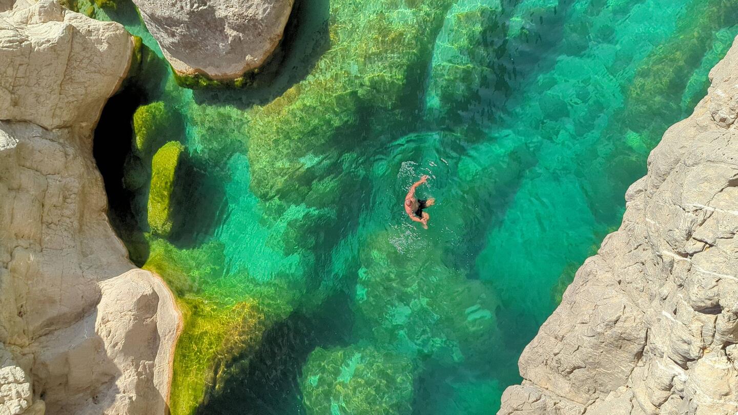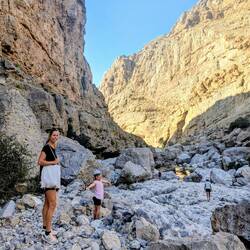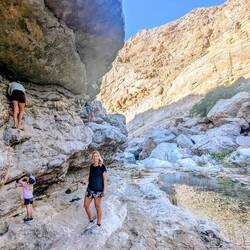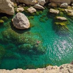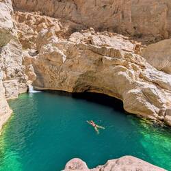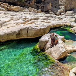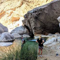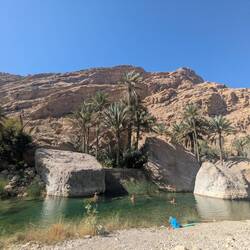 Ein Wadi ist im Oman ein trockenes Flussbett, das sich tief durch die Landschaft zieht und in dem sich nach Regen oder durch Quellen glasklare Wasserbecken bilden. Diese grünen, kühlen Oasen wirken wie kleine Wunder inmitten der kargen Berge und genau so einen Ort wollen wir im Wadi Hawa entdecken.