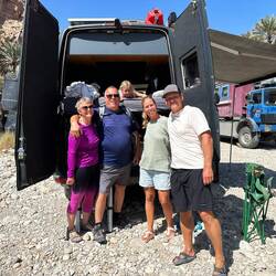 Die Zufahrt dorthin führt durch eine enge Felsschlucht. Autos stecken fest, es gibt nur eine Spur und kein Ausweichen. Als wir mittendrin stehen, bleibt uns nichts anderes übrig, als mühsam zurückzusetzen. Spontan entscheiden wir uns mit Jerome und Leslie für einen anderen Platz im Flussbett. Dort stehen wir wunderschön mit weitem Blick auf die Stadt. Am Abend machen wir ein Lagerfeuer, im Dutch Oven schmort das Essen, Hähnchen liegt auf dem Grill, und wir sitzen lange zusammen, bis die Dunkelheit kommt.