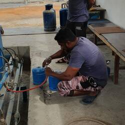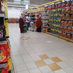 Auf der Suche nach Gas (GasFlasche füllen) versammelte sich eine Schar Inder und andere um unser Auto. Ein echter (!) Scheich (Titel) durfte nicht fotografiert werden. Er ging zur Seite. Man sagte mir, es ist der Bruder des Scheichs vom Emirat Ras Al Khaima (hier). In Ruhe hörte er sich unseren Wunsch nach Gas an. Er versorgte uns zunächst mit den besten Datteln (zwei Pakete). Er hatte einen gut Englisch sprechenden Assistenten dabei. Schließlich lud er uns mit den beiden leeren Gasbehältern in sein dickes Auto. Und fuhr uns mit seinem Assistenten zur Gaskompanie. Dort wollte man die Flaschen nicht füllen. Unter der Autorität des Scheichs wurden die Flaschen dann doch gefüllt. Der Scheich bezahlte still-schweigend mit freundlicher Miene die Gasrechnung. Dann fuhr er uns mit 6 Kilo Gas zum Bulli zurück und überließ uns seinen Assistenten. Der fuhr uns nun in eine Zahnklinik wo ein Zahn eine Stunde behandelt werden mußte. Er bezahlte die Rechnung. Dann fuhren wir in ein indisches Restaurant und haben gut gespeist.
