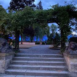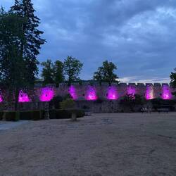 Wir sind nicht mal 1000 m gelaufen und schon sind wir an einem idyllischen Burghof, umgeben von mittelalterlichen Zinnen und Gebäuden. Hier finden auch regelmäßig Konzerte statt, denn eine BühneLue lisää