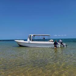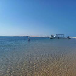 Ein Boot bringt uns in den Bazaruto National Marine Park. Wir besuchen zwei Inseln und schnorcheln am 2-mile-reef, einem der besten Spots weltweit.