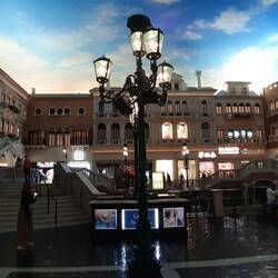 Auf dem Rückweg liefen wir noch durch die Shoppes des Venetian-Hotels. Eindrücklich, wie der Eindruck erweckt wird, man befinde sich tatsächlich in Venedig. Dazu trägt der gemalte Himmel an der "Decke* viel bei. Im "canale" fahren ständig gondolieri herum, meist allein. Einmal fuhr ein gondoliere eine chinesische Familie herum und versuchte sich dabei als Heldentenor, nicht mal schlecht nota-bene. Vermutlich hat ihm das ein fettes Trinkgeld eingebracht - verdient hätte er es.