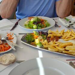 In den ersten beiden Restaurants herrschte sehr reger Betrieb. Dies führte dazu, dass wir über eine längere Zeit gar nichts bestellen konnten. So zogen wir weiter und fanden schließlich ein schönes Restaurant direkt am Meer. Nach einem längeren kreativen Bestellprozess kriegten wir schließlich eine riesige Platte mit einem falschen Filet drauf mit entsprechend vielen Beilagen und zusätzlichem Salat. Es gelang uns nicht, die riesige Portion aufzuessen. Im Saal gab es viele Familien, die miteinander zusammen an großen Tischen saßen und riesige Pfannen mit Meeresgetier vor sich hatten. Nachdem wir fertig gegessen hatten, liefen wir den Strand entlang bis nach Amorosa. Kathy war schon lange hier, jedoch hatte ihr Taxi-Chauffeur die Gelegenheit beim Schopf gepackt, um einige unnötige Zusatzkilometer einzubauen. Da Claudia und ich uns vorher am Strand ein bisschen hingelegt hatten, kamen wir erst gegen 6 Uhr in unserem Hotel an. Da wir am Nachmittag so opulent gegessen hatten, verspürten ich und Claudia keinen großen Hunger mehr. Dennoch gingen wir mit Kathy in ein nahes Restaurant. Ich ass eine wunderbare Crèpe, Claudia einen Gemüseteller und Kathy einen Oktopus. Satt und zufrieden machten wir uns wieder auf den Heimweg ins Hotel, wo wir für einmal früher als sonst zu Bett gingen.もっと詳しく