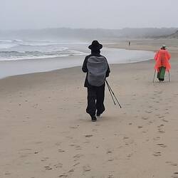 Bereits gestern konnten wir erfahren, wie easy es sich am Strand laufen lässt, und wir gar nicht im Sand einsanken. So beschlossen wir auch heute, direkt am Strand weiter zu gehen, und das war einfach unbeschreiblich schön und absolut meditativ. Der Himmel zeigte sich bedeckt, wir mussten auch jederzeit mit Regen rechnen und genau diese mystische Stimmung war so einzigartig, ja geradezu feierlich. An die drei Stunden, inzwischen regnete es auch ziemlich stark, sind wir am Strand entlang gelustwandelt. Da wir aber gewappnet waren und entsprechend ausgerüstet, hat uns das überhaupt nicht gestört. Im Gegenteil, ich hätte es nie für möglich gehalten, dass das Laufen im Regen so reizvoll sein kann. Dieser Strand war aber auch einzigartig, einfach Strand, soweit das Auge reicht- fantastisch.
