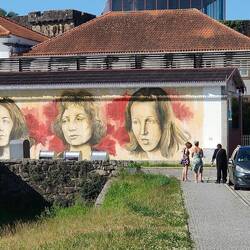 Unsere Reise startete bei blauem Himmel und angenehm kühlen Temperaturen. Zuerst führte uns der Weg durch die Altstadt von Caminha zu der Stelle, wo die Fähre den Rio Minho in rund 5 min. quert und die Passagiere, die z.B den Küstenweg weitergehen wollen, auf spanischen Boden entlässt. Der neue alternative Camino führt weitgehend dem tiefblauen Rio Minho entlang Richtung Valença an der spanischen Grenze. Zwischendurch trafen wir auf gepflegte Häuschen, aber auch auf heruntergekommene Herrenhäuser, die an bester Lage vor sich hin gammeln. Grundsätzlich fiel uns auf, dass die Menschen in dieser Gegend eher zu den besser Verdienenden zu gehören schienen. Als wir schliesslich am Ende unserer Tagesetappe in Vilanova de Cerveira anlangten, stellten wir fest, dass die Gemeinde über eine moderne, hochwertige Infrastruktur verfügt, angefangen von einem schönen Sportzentrum über einen vielseitigen Kinderspielplatz mit originellen Wasserspielen sowie allerlei Kunstwerke und beeindruckenden Hausmalereien, die über die ganze Stadt verteilt waren.