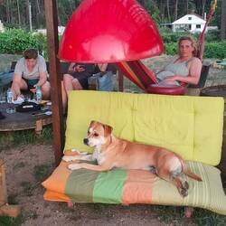 Hin und wieder kam der Doggy von Dries bei den einzelnen Pilgern vorbei und versuchte ein Stück Fressi zu erhaschen. was ihm aber leider nicht gewährt wurde. Der Hund ist ein Strassenhund, den Dries vor ungefähr einem Jahr aufgelesen hat. Es ist ein Staffordshire-Terrier, also ein zünftiger Kampfhund, der aber inzwischen lammfromm ist und ständig seinem Herrchen hinterherläuft. Dries musste allerdings ein Jahr intensiv mit ihm arbeiten, bis er ihn auf Kurs hatte. Dries ist ein Selfmade-Man, der eigentlich alles ausser den Mauern und dem Dach selber gezimmert hat. Die Betten sind aus dicken Holzteilen zusammengesetzt, die aus Abfällen einer nahe gelegenen Fabrik stammen. Nachdem die Sonne untergegangen war, sassen wir noch gemütlich im Garten zusammen und genossen die schöne Stimmung. Kurz vor Mitternacht gingen wir ins Bett.
