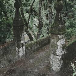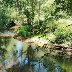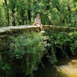 Anschließend mussten wir ein bisschen in die Höhe steigen, um dort oben dem Pilgerweg wieder zu folgen. Das Navi unterstützte uns sehr dabei, den weiteren Weg zu finden, da zum Teil die Wege nicht mehr so gut angeschrieben waren. Schließlich ging es einen idyllischen Wald hinunter zu einem Bach, den wir auf einer Steinbrücke überquerten. Auf der anderen Seite angekommen liefen wir weiter durch ein kleines Dörfchen, wo uns drei kleinere Hunde mit einem Bellkonzert begrüßten.