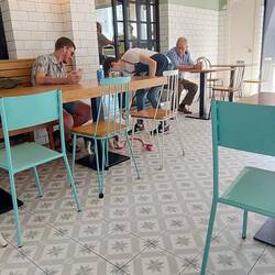 Um 8:30 Uhr war Kathy nirgendwo zu sehen, und wir riefen sie an, um zu prüfen, ob sie sich verirrt hatte. Er stellte sich jedoch heraus, dass sie verschlafen hatte. So begaben wir uns abermals in eine Bar und warteten dort auf sie. Als sie dann angekommen war, gingen wir mit ihr zusammen in den Supermarkt, um uns ein Picknick zusammenzustellen.