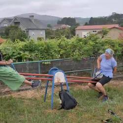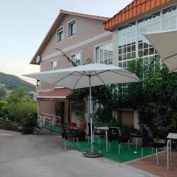 Der erste Teil der Etappe führte nach O Porriño. Der Weg führte zum Teil sehr malerisch einem Bächlein entlang. In O Porriño, das etwa auf halbem Wege lag, machten wir eine Rast in einem Café. Anschließend stiegen die Temperaturen immer mehr an, und es war auch kein Schatten mehr in Sicht. Unterwegs kühlten wir unsere Köpfe an einem Brunnen und Claudia nässte zusätzlich ihr Halstuch und wickelte es sich um den Kopf, um nach Beduinenart weiterzulaufen. Der Weg führte je länger je mehr bergauf, und so mussten wir immer mehr Erholungshalte einschalten. Unterwegs halfen wir einer Pilgerin, die aus dem letzten Loch pfiff, eine Unterkunft zu finden. Als wir die Unterkunft reserviert hatten, merken wir, dass die Unterkunft an einem ganz anderen Ort lag. Die Reservation verpuffte somit im Universum. Nachdem auch wir unsere letzten Kräfte fast aufgebraucht hatten, erblickten wir in der Ferne zum Glück eine Bar, wo wir uns bei einem kühlen Cider wieder aufbauen konnten. Diese Kühlung war jedoch nur von bescheidener Dauer. Schon bald kochten unsere Köpfe wieder und nun waren wir es, die aus dem letzten Loch pfiffen. Glücklicherweise tauchte erneut auf wundersame Weise eine Bar auf, wo wir erneut unsere müden Glieder ausruhen konnten. Nachdem wir uns ein wenig mit einer einheimischen Familie, die einen Ausflug hierher gemacht hatte, unterhalten hatten, nahmen wir den letzten Abschnitt unter die Füsse. Glücklicherweise ging es jetzt bergab. Nach rund einer halben bis dreiviertel Stunde kamen wir endlich in Saxamonde an. Unser Zimmer war sehr schön. Ich und Claudia übernachteten in einem Fünfer-Schlag, den wir alleine benutzen konnten. Nach einer erfrischenden Dusche gingen wir in die einliegende Bar und assen das Nachtessen. Kathy verlangte noch einen Ventilator und wir konnten in unserer luxuriösen Loge ebenfalls ein bereits vorhandenes Air-Condition-Gerät anwerfen.