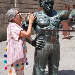Das Wetter war uns nicht allzu wohlgesinnt, es war regnerisch und ordentlich frisch, so um die 15°, ein enormer Unterschied zu den aktuellen Temperaturen in der Schweiz, resp in Zürich (35°) Dennoch freuten Kathy und ich uns auf die heute angesagte Shoppingtour. Genau wie in Pontevedra gibt es hier in Santiago viele kleine, doch recht schick eingerichtete Boutiques, welche wir besuchen wollten. Claude bevorzugte natürlich stattdessen einen weiteren Rundgang durch den sehr schönen Park Alameda. Vorerst galt es aber für Kathy einen Koffer zu besorgen, denn für sie wird die Reise weitergehen, und der Gepäcktransport per Correos ist nicht mehr möglich. So bevorzugte sie einen Rollkoffer anstelle des grossen Rucksackes. Tatsache war auch, dass wir ab diesem Tag keine Pilger/Pilgerinnen mehr waren. Entsprechend feierlich entfernten wir unsere Muschel vom Tagesrucksack. Am späteren Nachmittag plante Kathy mit dem Bus nach Porto zurückkehren, wo sie dann zwei Tage später Reinette und Coleen treffen würde. An diesem Abend also mussten wir Abschied voneinander nehmen. Erstaunlich, wie wir in den vergangenen drei Wochen zusammengewachsen waren. Wir sind uns alle drei einig, dass wir einander ganz bestimmt fehlen werden. Wer hätte das gedacht bei unserer ersten Begegnung!