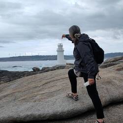 Claudia kaufte an einem Stand, der von einer Frau aus der Gegend betreut wurde, ein schönes Armbändchen mit einem funkelnden Stein. Alsbald kehrten wir zum Auto zurück und fuhren weiter nach Finisterre. Unterwegs begann es wie aus Kübeln zu regnen. Doch kurz vor Finisterre hörte der Regen glücklicherweise wieder auf, und so konnten wir trocken zum äussersten Felsen am Meer laufen, wo sich schon viele Leute eingefunden hatten. Nachdem wir uns dort auch ausgiebig umgesehen hatten, gingen wir noch in ein Café, das in ein Gebäude vor dem Leuchtturm integriert war.