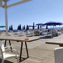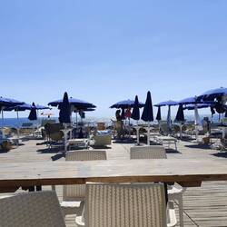 Nachdem wir eine Weile weitergefahren waren bekamen wir Lust auf einen kleinen Apero. Die Strandbar, die wir anfahren wollten, war saisonhalber nicht mehr im Betrieb. So nahmen wir unsere Getränke und ein paar Kleinigkeiten zu essen an den Strand, wo wir uns in einem ebenfalls leeren Lido (Gogo) im Schatten von einem grossen Sonnendach im Sand niederliessen und ein bisschen badeten.