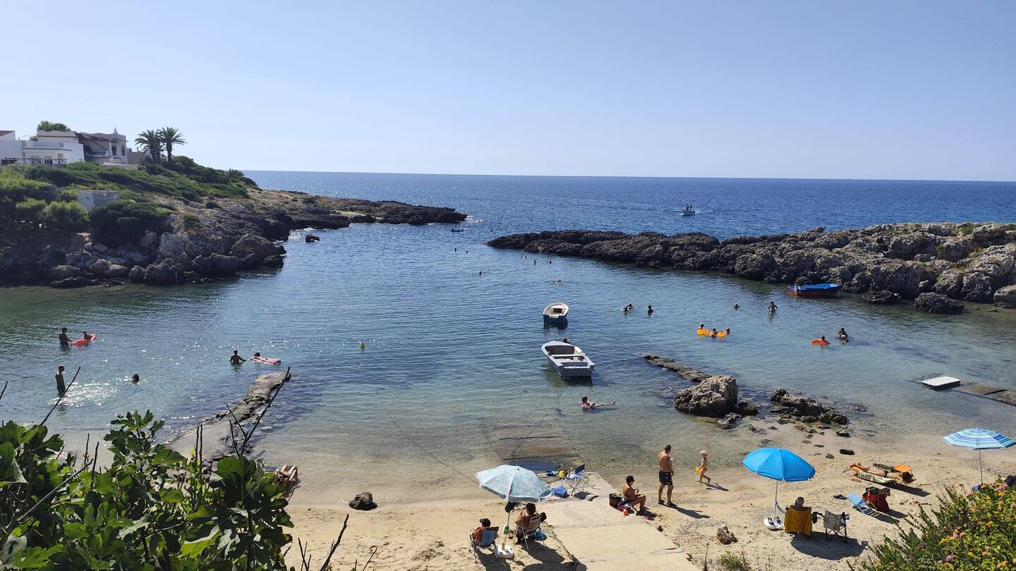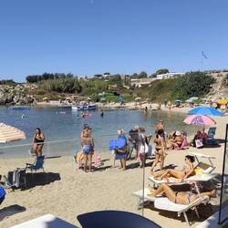 Nach dem Frühstück unternommen wir noch einen kleinen Bummel durch die Altstadt von Otranto. Nachdem wir ungefähr 20 Minuten gefahren waren, machten wir einen Abstecher nach der Baia dei Turci, einen tollen, langen Sandstrand mit kristallklarem Wasser in allen Blautönen. Vom Parkplatz her wurden wir zuerst mit einem kleinen Bähnchen ca 10 Minuten den Strand entlang gefahren, wo wir ausstiegen und dann noch rund eine Viertelstunde weiterlaufen mussten bis an den Strand. Es waren auffallend wenig Kinder zu sehen.