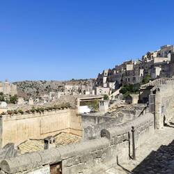 Nachdem wir unser tolles Hotel verlassen hatten, fuhren wir mit dem Auto nach Matera. Wir warteten immer auf die berühmt bekannte Kulisse, die wir von Fotos her aus dem Führer kannten, aber das Warten wurde vorerst nicht belohnt. Wir fuhren durch die Stadt auf der Suche nach einem Parkplatz und gleichzeitig suchen wir auch Hinweise auf die alte historische Stadt. Nach einer Weile fanden wir einen recht gut gelegenen Parkplatz und schauten dann in Google Maps nach, wo sich die Altstadt wohl befinden möge. Zum Glück lag sie nicht sehr weit entfernt, und die grossen Touristenmassen wiesen uns den Weg. Es reihten sich Lädelis an Lädelis, die alle versuchten ihre Dinge an die Touristen zu bringen. Von edlen Kleidern bis zu billigster Ramschware war natürlich alles zu finden.