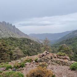 Obwohl sich der Himmel heute bedeckt hielt, war es schwül und warm. Unsere Wanderung führte uns vom Übernachtungsplatz am Fluss zu einer Auberge am GR 20, den wir auch ein Stück gingen. Im BlickLeggi altro