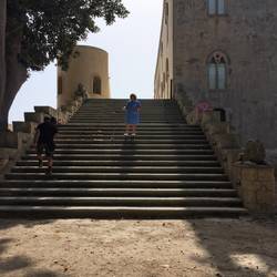 With have conquered the maze, then we headed up the wide staircase to look from the top of the balcony, this gave us views over the area, which didn’t look any greener from up here as to down there! The poor cleaning lady had been hard at it on the huge wide staircase sweeping away all the dirt and leaves, but to Honest it looked like a losing battle for her with the wind blowing stuff back to where she was cleaning it!