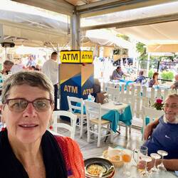 We went in by bus 🚌 to Plaka… the old town of Athens. We left around 9:30am, think we should have taken the Hop-on-hop-off bus for this one. Anyway got to the centre of town, things look a lot cleaner than they used too. We took a walk along the marble streets past the Acropolis… didn’t go in because we had been before, maybe we should have it’s been 23 years. After a few obligatory photos of doors we headed up the side streets of Plaka to check out the city and buy some stuff for the kids again. Sat in a small coffee shop.., Daphne’s for a nice coffee and apple tart. This was for a toilet stop as well. We continued on because we only had a short time to see what we wanted. Anyway the tart and the ice cream didn’t agree with Rell so we found a restaurant close to the pickup up point for a beer, sangria and soup. Also toilet stop. After that it was time for a few more photos before catching the bus back to the boat. Think we left one passenger behind, not sure how they got back. On the boat it was a bit of a chat with Vicki and mum on how their trip went and then relax until the show. Tonight Rell and I went to the early show “The Privateers” an Irish ☘️ folk song band. Not to bad. Then off to dinner. We had to go to the buffet because our dinner sitting was early. We have a new name for it now “The Pig Pen” because that is what it’s like. Don’t think we will do that again. Then we caught up with mum and watched the singers and dancing for awhile before heading off to bed. Another good day.