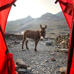 Es wird wieder grau am Himmel und wir kehren um. Am Lager angekommen besuchen uns drei Esel in unserem Lager. Carola ist ganz hingerissen und entschließt sich, den Esel mit unseren Käsebrötchen zu füttern. Das scheint einen der Esel so begeistern, dass er entschließt, dass er evtl in unser Zelt reingehen sollte. Es ist warm und wer weiß, vielleicht gibt es mehr Futter!