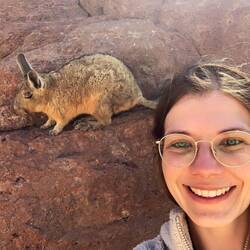 Beim Näherkommen entdecken wir die wahre Attraktion. Der Felsen ist voller Fellbälle! Die Viscachas sind hier anscheinend an Menschen gewöhnt und man kommt so nah an sie ran, dass man nur einen Finger ausstrecken müsste. Viel näher als wir am Pico Austria rangekommen wären. Es sind sehr besondere Tiere, die im ersten Moment an Hasen erinnern. Der lange Schwanz und die immer halb geschlossenen Augen verraten aber ein anderes Tier dahinter. Wenn sie so auf ihren Steinen auf den Hinterbeinen sitzen sehen sie eher aus wie kleine plüschige Buddhas. 🥹