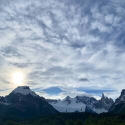 Oben angekommen müssen wir noch über ein Schneefeld und sind endlich am Endpunkt. WOW - Mount Fitzroy ist komplett sichtbar und vor ihm liegt ein großer Gletschersee, der komplett zugefroren ist. Wir ziehen unsere Handschuhe und Daunenjacke an, um nicht auszukühlen, essen unsere Müsliriegel und warten die nächsten 30min, dass die Sonne sich langsam über den Horizont bewegt und den Berg in goldenes Licht taucht.