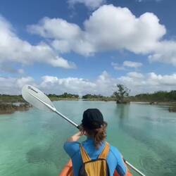 Wir fahren noch ein gutes Stück weiter, bis es wieder ganz ruhig wird. Nur noch türkisblaues Wasser, Mangroven und wir. Felix schafft es sogar, seine Drohne kurz steigen zu lassen, um ein paar Aufnahmen von den bunten Kayaks zu schießen. Auf dem Rückweg paddeln wir noch einmal kräftig gegen die Strömung an und kommen pünktlich wieder beim Kayakverleih an. Hier bleiben wir noch ein Weilchen, planschen, schaukeln auf den Schaukeln im Wasser, und essen unsere mitgebrachten Kekse. Ein guter Tag! :)