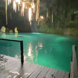 Nach ca 15 Minuten kommt noch ein anderes Pärchen dazu, das war es dann aber auch schon an Menschen hier. Wir genießen die Ruhe, die Kühle und die Eindrücke noch weitere 30min und machen uns wieder auf. Wir wollen noch eine weitere Cenote sehen und eine Mayaruine in der Nähe. Die zweite Cenote ist ebenso beeindruckend. Sie ist komplett unterirdisch und hat keine offene Decke mit Sonnenlicht, dazu ist sie 80m tief, was sie von türkisblau am Rand zu dunkelblau bis schwarz in der Mitte aussehen lässt. Das Wasser ist kristallklar, man kann sogar von den Seiten reinspringen und auch hier sind wir mit 4 anderen Leuten ziemlich alleine. Beim Rausgehen erfahren wir, dass sich eine Reisegruppe angekündigt hat, mit ca 200 Leuten, und wir sind richtig froh, das nicht miterlebt zu haben.