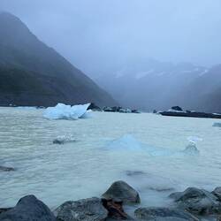 Im Großen und Ganzen ist die Wanderung okay, sie ist ziemlich ausgebaut und etwas langweilig, da es keinerlei Herausforderungen oder Anstiege gibt. Es wirkt ein wenig wie ein langer Spaziergang, an dessen Ende ein Gletschersee mit kleinen Eisbergen auf uns wartet. Wir machen kurz ein paar Fotos und schon sind wir wieder auf dem Weg zurück. Es ist einfach zu nass, windig und kalt hier am ungeschützten See, an dem sich der Wind so richtig austoben kann.