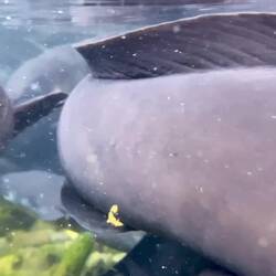 Als Carola auf Entdeckungstour geht, sieht sie, was die Aufmerksamkeit aller Leute auf sich zieht: Unterm Steg im Wasser im Schatten liegen 10-20 Aale! Und sie lassen sich dort von den leichten Wellen einfach hin und her treiben und bewegen sich nicht viel. Sie sind so nah am Ufer, dass man sie anfassen kann, und sie lassen es auch zu! Es sieht aus wie ein Haufen schwarzer Baguettes die hier unterm Steg rumliegen, und sie sind riesig! 😂